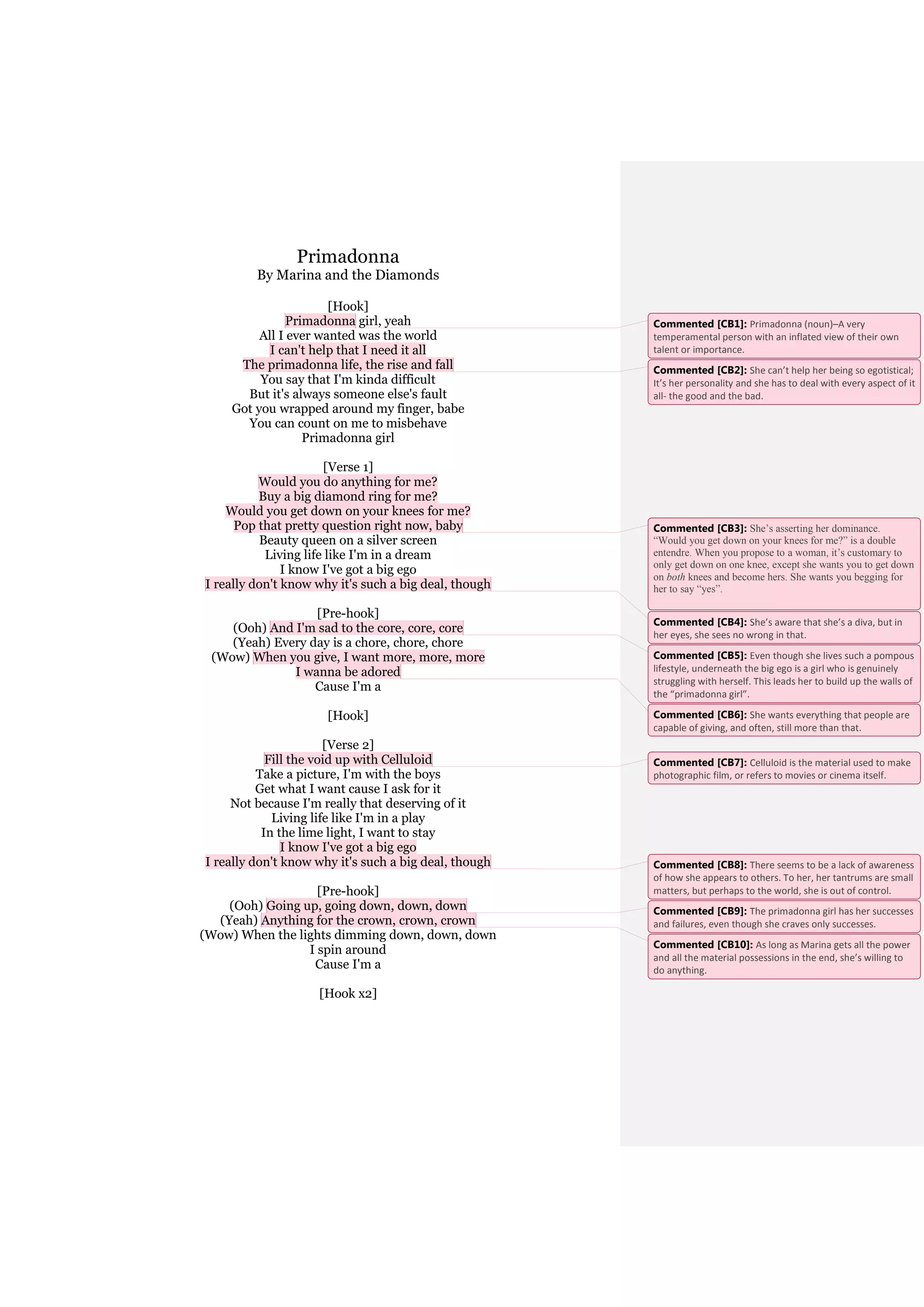 The song describes a "primadonna girl" who has an inflated ego and sense of self-importance. She demands lavish gifts and adoration from others. Underneath her large ego, she struggles with insecurity and uses her diva persona to shield herself. While she lives a glamorous lifestyle, she is unhappy and constantly craves more attention, material items, and validation from others to fill the void she feels.