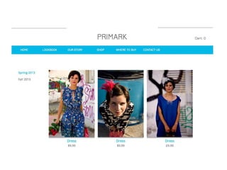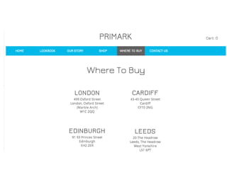 Primark currently does not have an online store despite demand from customers. Competitors like other high street brands have online presences. The document proposes creating an online store to reach more customers worldwide, engage through new communication channels, and increase sales. A strategy is outlined that would target fashion-conscious women aged 15-30 in cities through a trendy, affordable brand positioning online. Tactics include redesigning Primark's website with an online store, search marketing, affiliate marketing, and social media promotions. Key performance indicators like website traffic and sales would track the strategy's success.