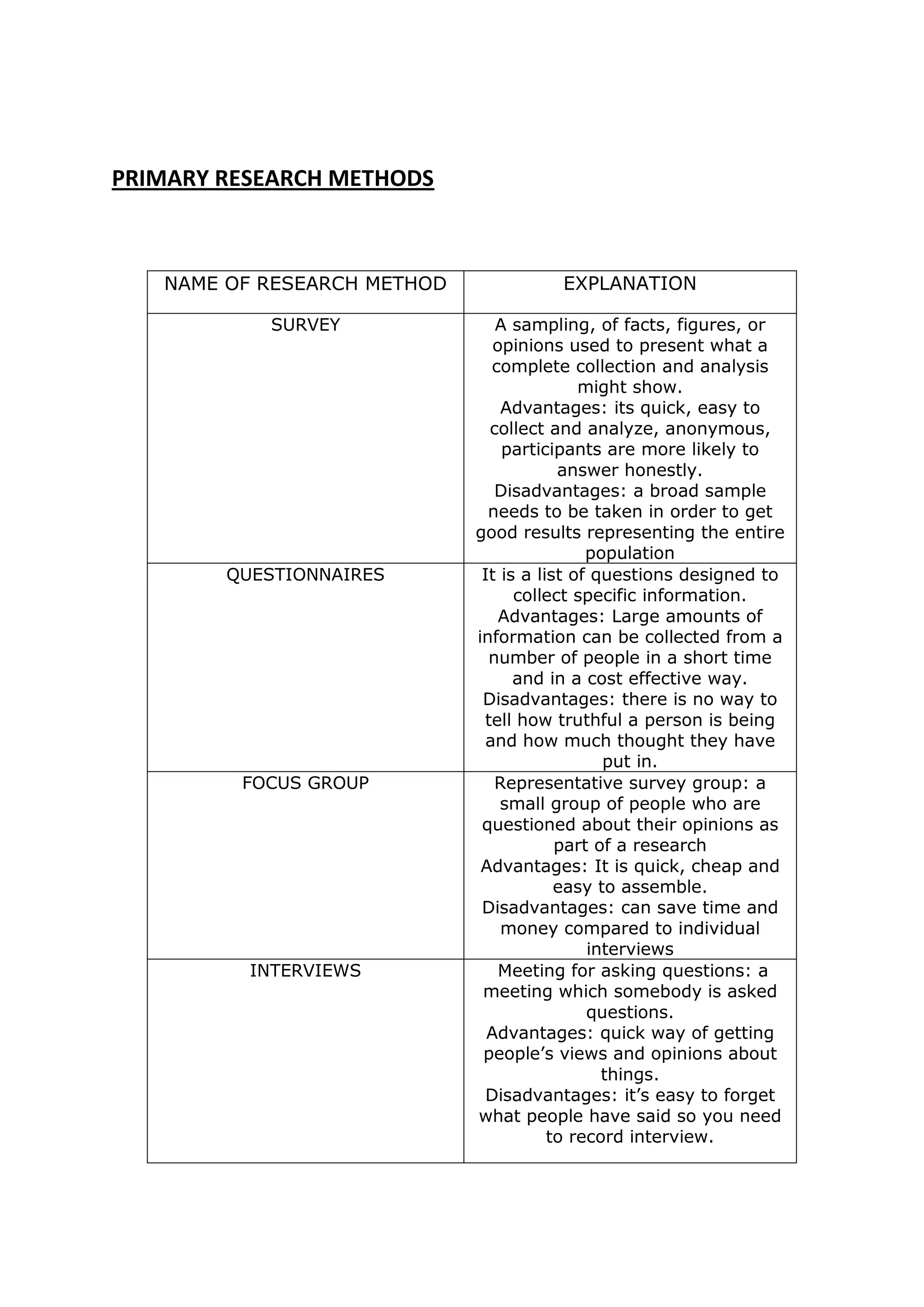 The document describes four primary research methods: surveys, questionnaires, focus groups, and interviews. Surveys involve collecting a sample of data to represent a whole population, and have advantages of being quick and allowing anonymity, though a broad sample is needed. Questionnaires are lists of questions to collect specific information from many people quickly and cost-effectively, but truthfulness cannot be verified. Focus groups question a small representative group which is cheap and easy to conduct, but may not save as much time as individual interviews. Interviews are meetings where questions are asked, providing a quick way to gather views, but responses must be recorded to avoid forgetting details.