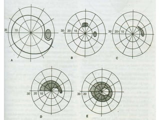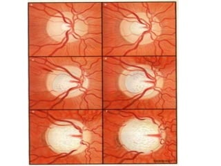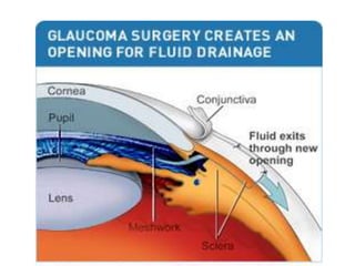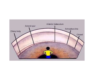Primary angle closure glaucoma is caused by blockage of the aqueous humor outflow due to closure or narrowing of the anterior chamber angle. It progresses through stages from primary angle closure suspect to acute angle closure to angle closure glaucoma, where glaucomatous optic nerve damage and visual field defects are present. Risk factors include hyperopia, smaller anterior chamber angle, older age, and Asian ethnicity. Treatment begins with intravenous mannitol or glycerol to lower pressure urgently, followed by topical eye drop medications like beta-blockers or pilocarpine. The definitive treatment is laser iridotomy or trabeculectomy surgery to permanently open the drainage angle.