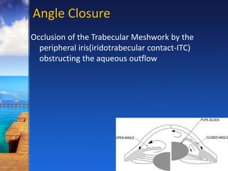 This document discusses primary angle closure glaucoma (PACG). It begins by describing the stages of PACG from primary angle closure suspect to primary angle closure glaucoma. It then covers risk factors, mechanisms (including pupillary block and non-pupillary block), signs and symptoms, investigations, and treatment approaches including laser iridotomy, medications, and surgery. The treatment goal is to eliminate iris blockage and lower elevated intraocular pressure to prevent optic nerve damage.