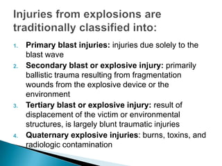 The document provides an update on primary blast injuries, including their classification into various types and their pathophysiology. Key injuries discussed include tympanic membrane rupture, blast lung injury, and gastrointestinal injuries, emphasizing the importance of prompt diagnosis and management strategies. Additionally, the document highlights the complexities in evaluating and treating blast victims due to potential internal injuries and the need for immediate resuscitation efforts.