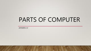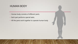 The document discusses the different parts of a computer system and their functions. It compares a computer system to the human body, noting that both are made up of different parts that each perform special tasks and work together. The main parts of a computer discussed are the monitor, CPU, keyboard, mouse, printer, and speakers. The CPU is described as the "brain" of the computer. The keyboard is used for typing, and the mouse is used to point at things on the screen.