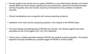 Primary central nervous system vasculitis (PACNS) is a rare disorder characterized by inflammation of blood vessels in the brain and spinal cord. It presents with non-specific symptoms like headache, cognitive impairment, and focal neurological deficits. Diagnosis involves neuroimaging showing multifocal lesions, angiography revealing vessel narrowing and dilation, and brain biopsy detecting immune cell infiltration of vessel walls. While the cause is unknown, infectious agents may trigger PACNS. Treatment involves immunosuppression but prognosis depends on disease severity and response to treatment.