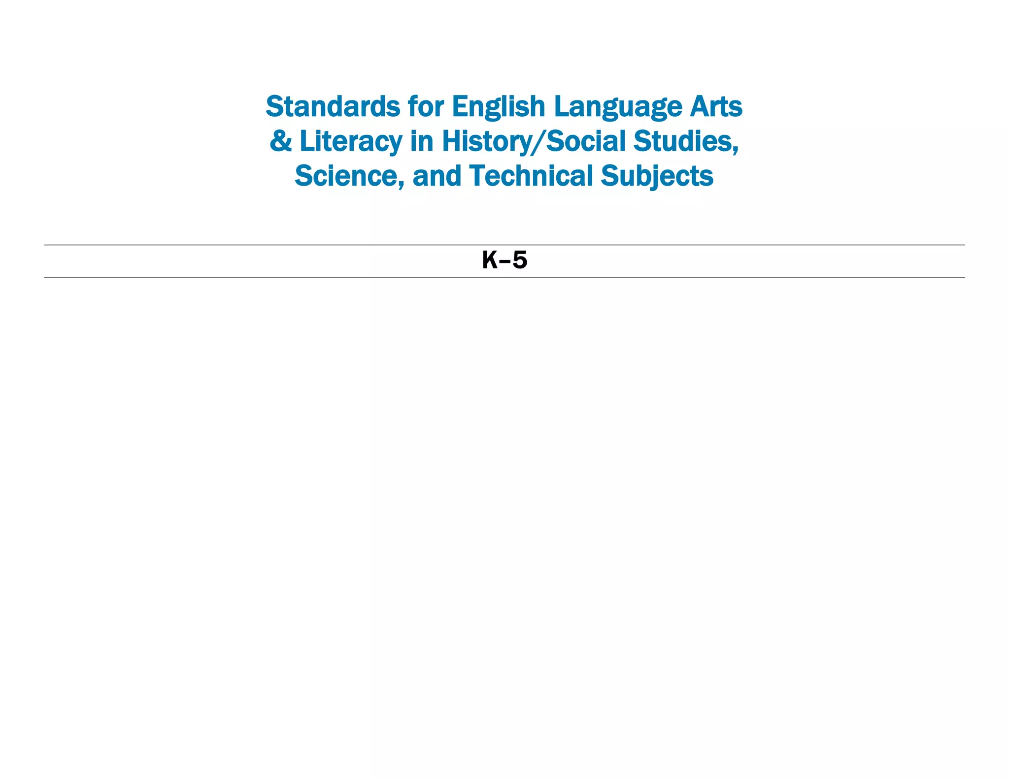 This document outlines the standards for English Language Arts and Literacy for kindergarten through 5th grade. It includes the College and Career Readiness Anchor Standards, which provide broad standards that define what students should understand and be able to do by the end of each grade. The standards are broken down into sections including Reading Standards for Literature, Reading Standards for Informational Text, Reading Standards: Foundational Skills, and Writing Standards. Each section lists the standards for each grade level kindergarten through 5th grade. The standards define the key skills students should master in areas such as reading comprehension, vocabulary, fluency, and writing.