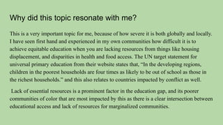 The document discusses the critical issue of resource gaps in education, particularly affecting marginalized communities and highlights the UN's target for universal primary education. It emphasizes community-based contributions, such as volunteering and donations to local educational and support programs, as effective ways to bridge this gap. Additionally, it underscores the importance of social media in raising awareness and mobilizing resources for education both locally and globally.