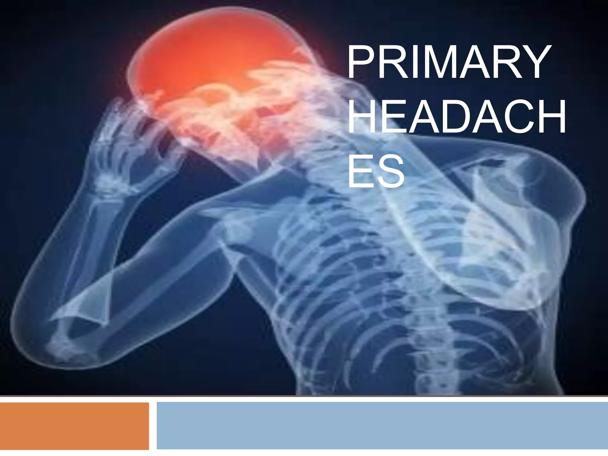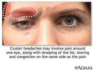 This document summarizes several types of primary headaches including trigeminal autonomic cephalalgias (TACs). TACs are short-lasting headache attacks associated with cranial autonomic symptoms and include cluster headache, paroxysmal hemicrania, and SUNCT. Cluster headaches are characterized by severe, unilateral pain and periodicity with daily bouts. Paroxysmal hemicrania causes very severe, short-lasting unilateral headaches very frequently and responds well to indomethacin. SUNCT involves severe orbital or temporal pain with stabbing or throbbing quality and cutaneous triggerability of attacks. The document also briefly outlines other primary headache types such as hemicrania continua,