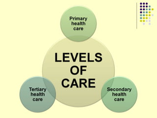 The primary health centre occupies a key position in rural health care as the first point of contact between individuals and the health system. It aims to provide comprehensive and affordable preventive, promotive, and curative services to rural populations of about 30,000 in plains and 20,000 in hilly/tribal areas. Staffing typically includes a medical officer, pharmacist, nurse, and other paramedics. Services include outpatient and inpatient care, maternal and child health services, immunizations, nutrition programs, and monitoring of national health programs.