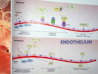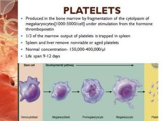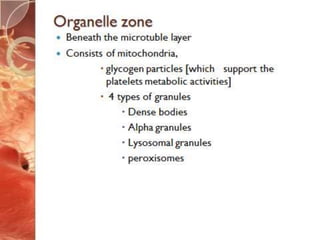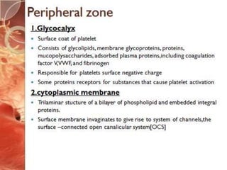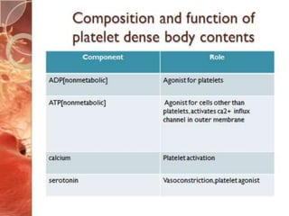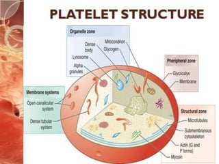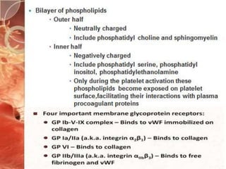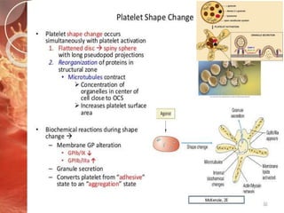 The document outlines the role of platelets in hemostasis, emphasizing their structure and functions, including adhesion, activation, and aggregation. Key processes involve the interaction of platelets with collagen, von Willebrand factor, and various agonists, which lead to the formation of a hemostatic plug. It highlights the biochemical changes during platelet activation and the formation of bridges between platelets mediated by fibrinogen.