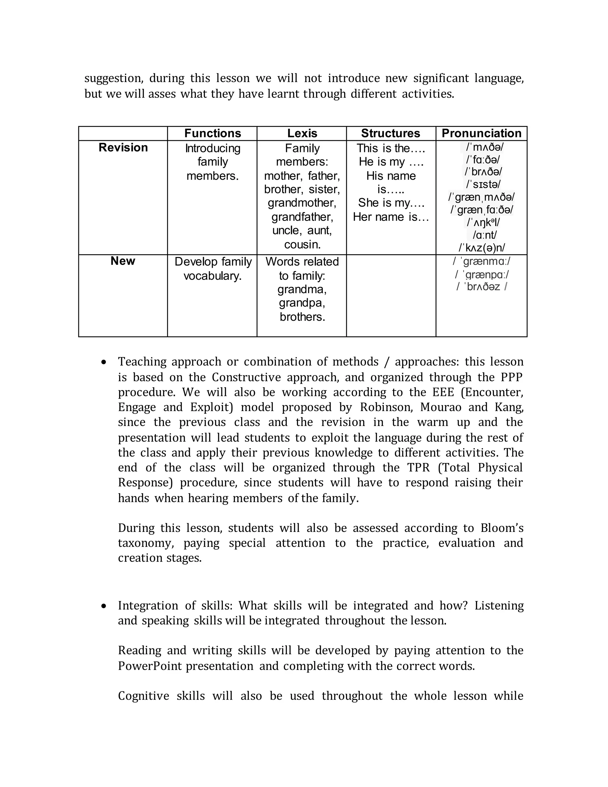 This lesson plan aims to reinforce students' knowledge of family vocabulary through a variety of engaging activities. Students will sing greetings songs, introduce their families, listen to songs identifying family members, and complete a PowerPoint presentation practicing family terms. The plan incorporates listening, speaking, reading and writing skills through groupwork, songs, presentations and worksheets. It follows a Constructivist PPP approach and integrates skills development according to Bloom's Taxonomy. The teacher will assess students' understanding and application of family vocabulary throughout the interactive lesson.