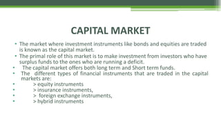 The document discusses the capital market, focusing on the primary market where new securities are issued. It outlines the roles of various players, including underwriters and lead managers, and describes methods of issuing shares such as Initial Public Offerings (IPOs) and rights issues. Additionally, it covers processes like book building and pricing guidelines for new issues, highlighting the significance of underwriting and marketing in facilitating public offerings.