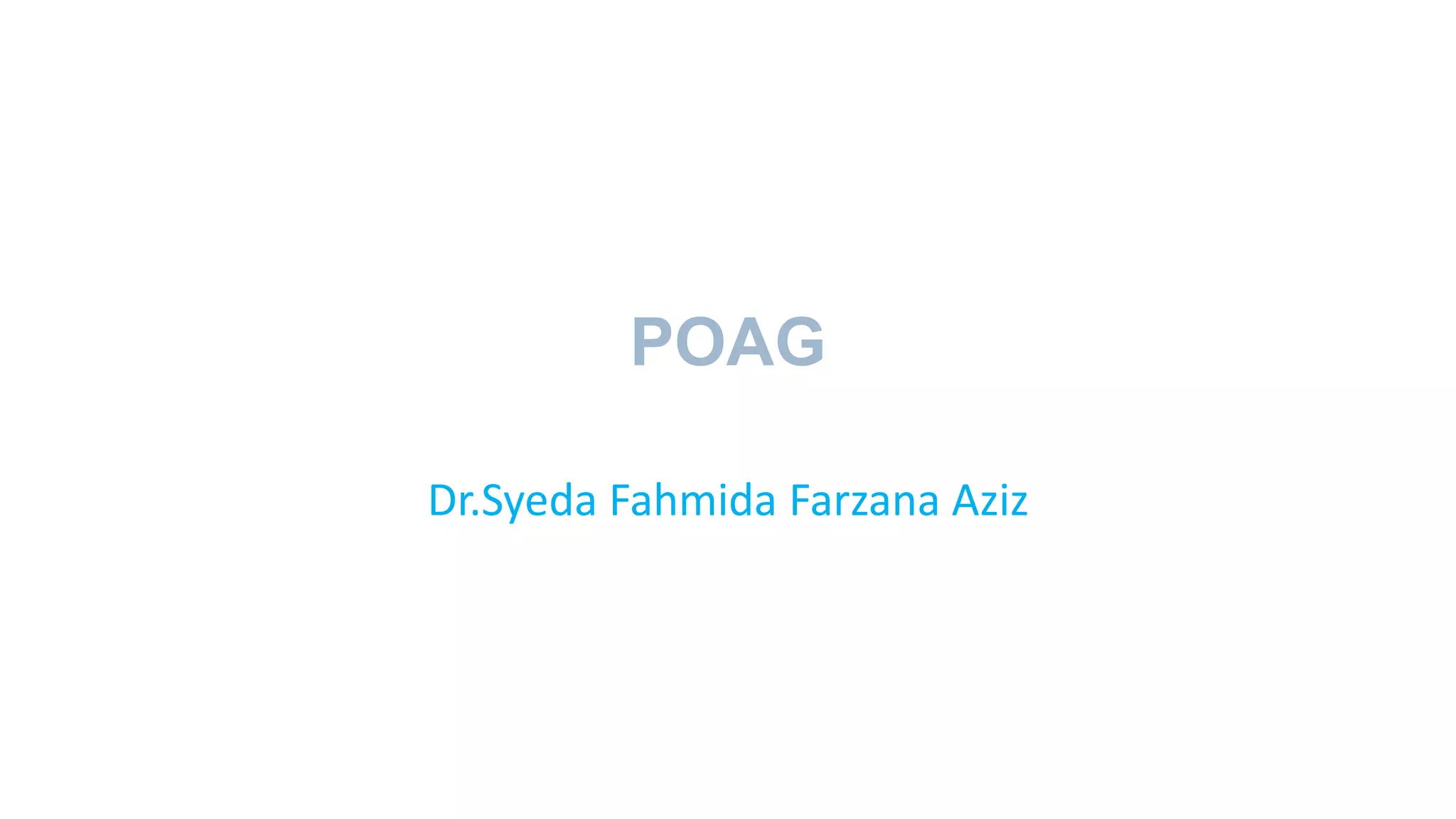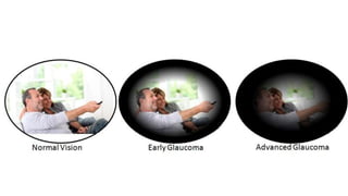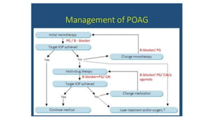 Primary open-angle glaucoma (POAG) is characterized by elevated intraocular pressure, glaucomatous optic nerve damage, and an open anterior chamber angle. It is the most common type of glaucoma and risk factors include older age, family history, and elevated eye pressure. The goal of treatment is to lower eye pressure through medications, laser therapy, or surgery in order to slow the progression of vision loss and prevent blindness. Regular eye exams are important for screening and monitoring the disease.