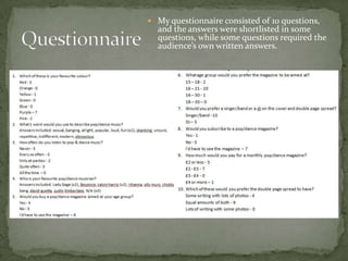 The questionnaire results showed that purple was the favored color and that words like "fun" described pop/dance music. Most listeners enjoyed it occasionally or at parties. Lady Gaga and Calvin Harris were popular artists and the target age group was 16-21. Readers preferred a singer/band on the cover rather than a DJ. They would pay £2-3 for the magazine and wanted an equal balance of photos and words in double page spreads. This information will help design a magazine aimed at casual pop/dance music fans age 16-21.