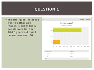 The survey asked 5 questions about preferences in 2D games. For question 1, most respondents were between ages 10-20 with one person over 30. Question 2 found that the majority play 2D games with one person saying no. Gameplay was favored most in question 3 over other factors like artwork. Question 4 revealed a preference for 2D adventure games followed by fighting and RPGs. Question 5 identified bad graphics and depth perception as common criticisms of 2D games.
