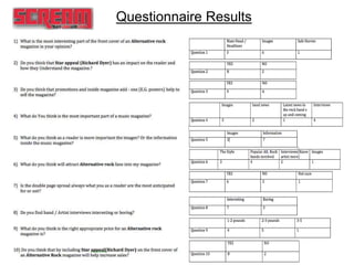 Jon Villacci conducted primary research through a questionnaire to gather information about what readers find most appealing in an alternative rock magazine. The responses indicated that images, interviews, popular bands, and information are most interesting to readers. Star appeal and promotions were also found to impact readership. The appropriate price range was determined to be £2-3, which is consistent with similar magazines. The research provided insights into design elements and content that will attract readers and influence sales of Jon's magazine.