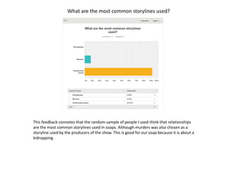 The document summarizes primary research results about soap operas. It asked participants questions about common soap opera storylines (relationships and murder), characters (strong female characters), target audiences (females and working class aged 30-60 who find escapism and can relate to the situations), and how to make a soap opera appealing to those who normally do not like the genre (aim for primetime and an engaging trailer). The research provides insights into soap opera tropes and audiences to help develop a new soap opera.