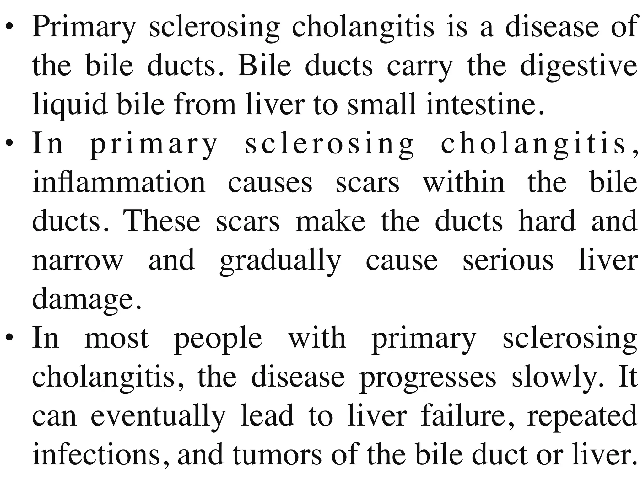 Primary sclerosing cholangitis is a disease that causes inflammation and scarring of the bile ducts, resulting in liver damage over time. It has no known cause but may be triggered by an immune reaction in genetically predisposed individuals. Symptoms include fatigue and itching initially, with potential later complications of liver failure, infection, and cancer. Diagnosis involves blood tests, MRI or other imaging of the bile ducts, and potentially a liver biopsy. While there is no cure, treatments focus on managing complications through antibiotics, procedures to open blocked ducts, and potentially liver transplantation.