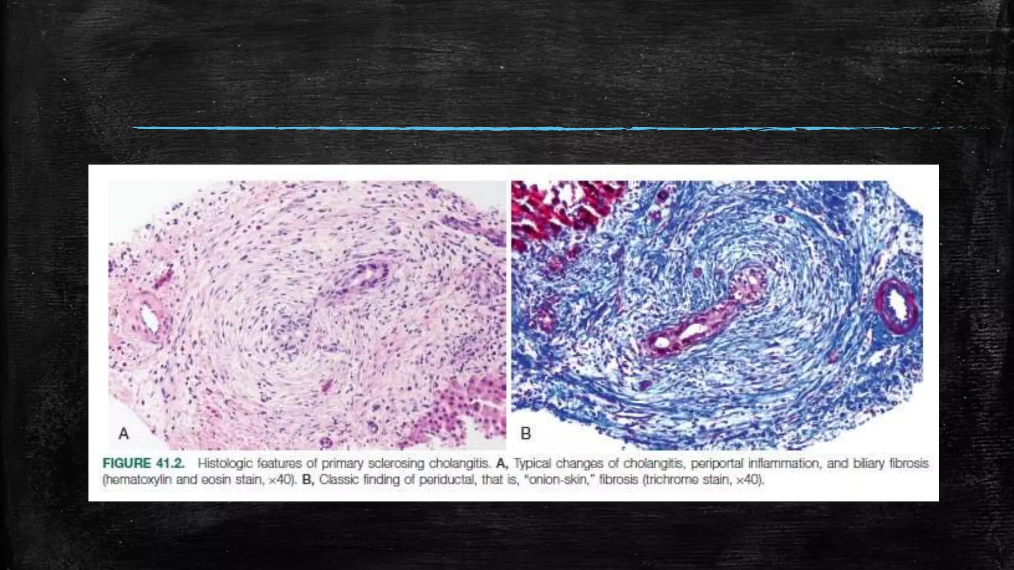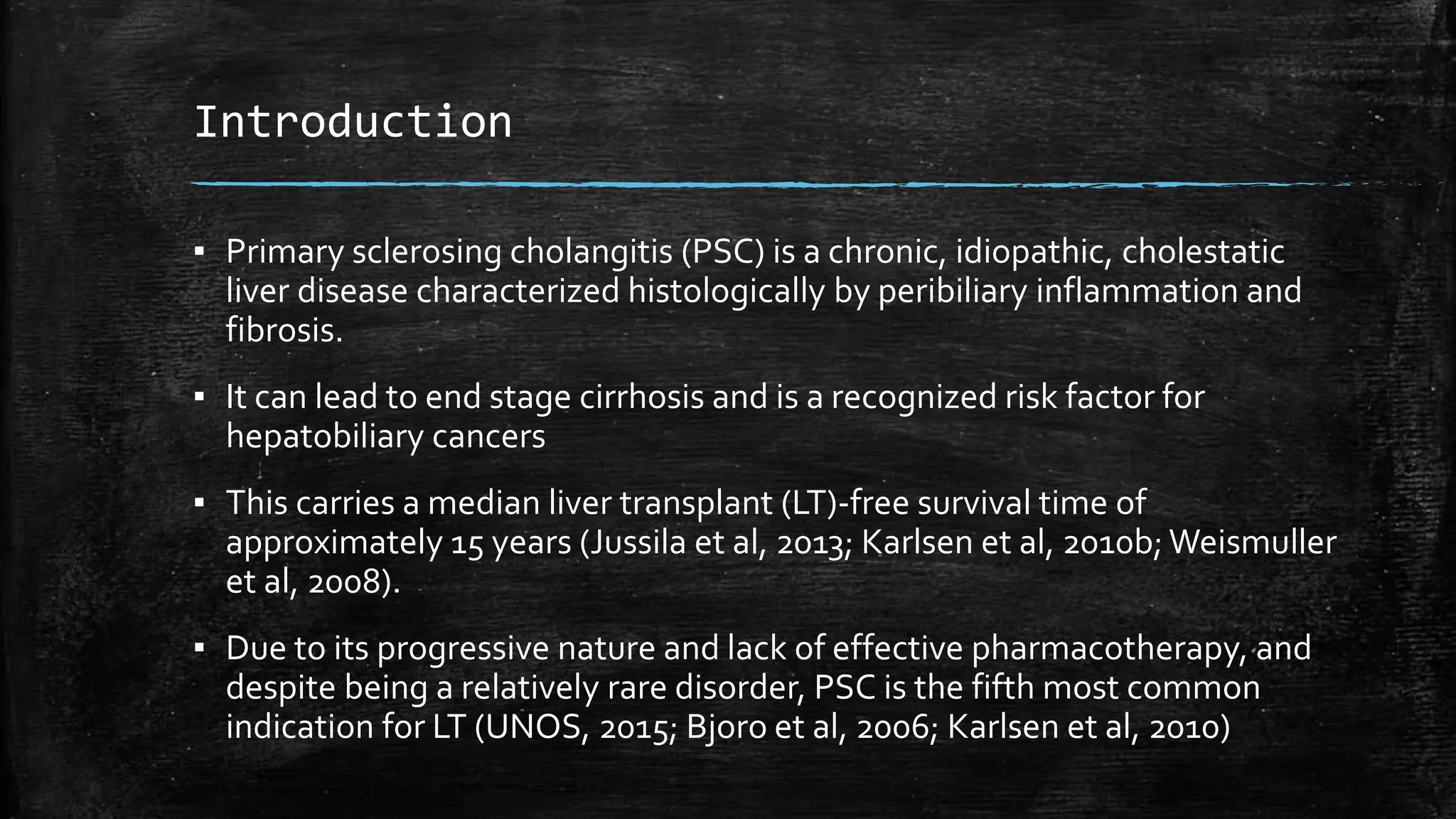 Primary sclerosing cholangitis (PSC) is a chronic liver disease characterized by inflammation and fibrosis of the bile ducts that can progress to cirrhosis and liver cancer. It has a median survival time of 15 years and is the fifth most common reason for liver transplantation. PSC commonly affects males in their 40s and is associated with inflammatory bowel disease. Diagnosis involves clinical features, blood tests showing cholestasis, and imaging or biopsy of the bile ducts. Treatment includes medications like ursodeoxycholic acid and antibiotics, as well as endoscopic procedures and ultimately liver transplantation for advanced disease.