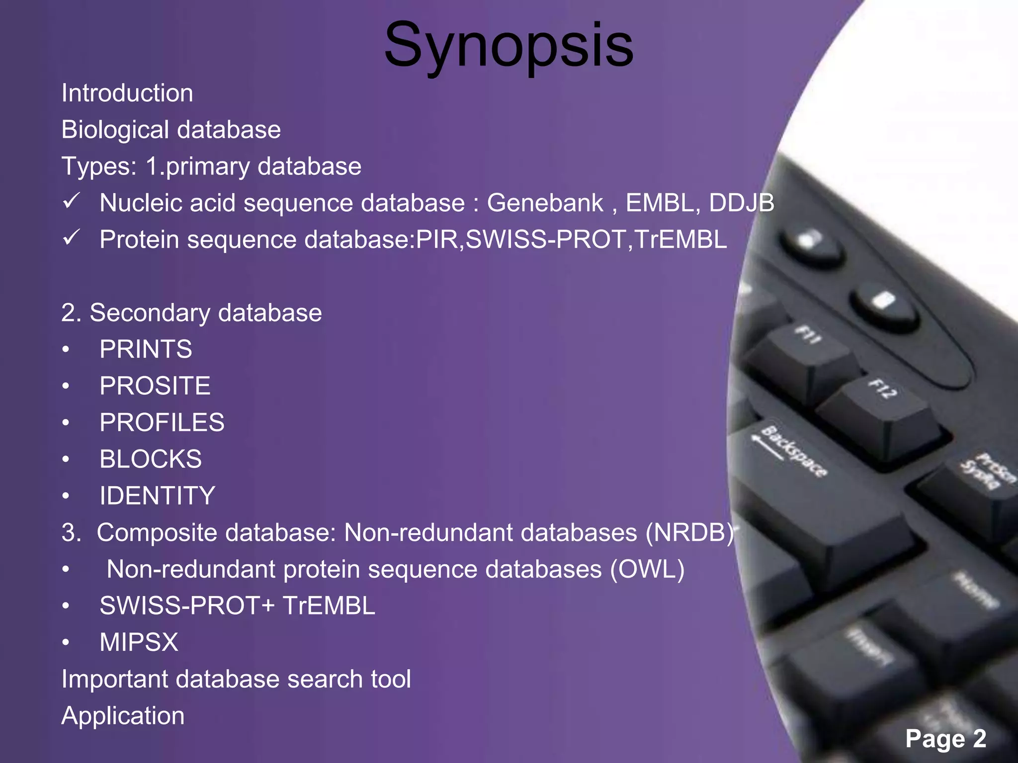 This document provides an overview of biological databases, categorizing them into primary, secondary, and composite types, as well as detailing specific examples like GeneBank, EMBL, and Swiss-Prot. It discusses the importance of these databases in storing, retrieving, and analyzing vast biological information for various research areas. Additionally, it highlights the applications of biological databases in fields such as medicine and agriculture, while emphasizing their essential role in biological research.