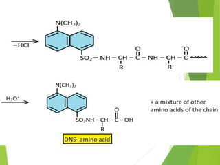 Peptides are formed by the condensation of amino acids, with a specific structure that includes an N-terminal and C-terminal residue. The primary structure refers to the exact sequence of amino acids in a polypeptide chain, which can be determined through methods such as Sanger's or Edman degradation for N-terminal analysis and enzymatic methods for C-terminal analysis. Various chemical reactions and chromatography techniques are employed to identify and analyze amino acids in the peptide sequence.