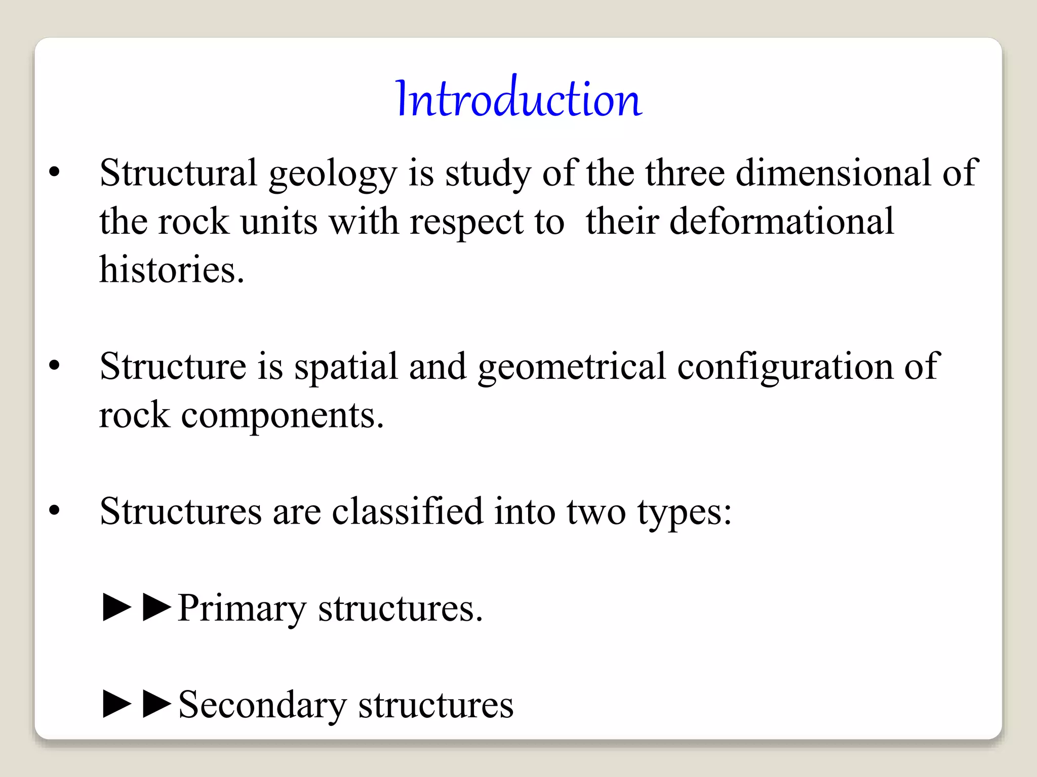 The document discusses primary structures in structural geology, focusing on sedimentary and igneous rocks. It details various types of primary structures such as bedding, lamination, cross-bedding, and grading in sedimentary rocks, as well as features like sand dunes and ripple marks. Additionally, it covers igneous structures including dykes and sills, highlighting their formation and relationship with surrounding rock layers.