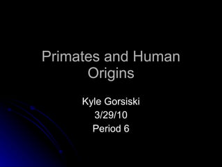 The document discusses primates and human origins. It defines hominids and primates, noting that hominids evolved to walk upright and have opposable thumbs, while primates have binocular vision and well-developed brains and limbs. It outlines the two hypotheses for modern human evolution - the multi-regional model suggesting independent evolution in several places, and the out-of-Africa model where Homo sapiens first evolved in Africa from earlier species like Homo habilis, Homo ergaster, and Homo erectus. It also discusses Homo neanderthalensis and evidence that Homo sapiens lived alongside them around 50,000-40,000 years ago.