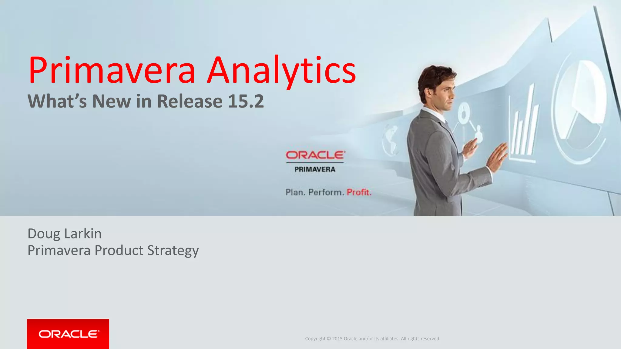 Oracle's Primavera Analytics release 15.2 introduces enhanced features for deeper insight into project costs and schedules, including greater visibility into Primavera P6 and Unifier data. Key updates include the ability to analyze historical changes in user-defined fields, extended workflow analytics, and the integration of cost and schedule data through conformed dimensions. The release also offers a pre-built analytic data warehouse with numerous dashboards and metrics to support business intelligence in enterprise project portfolio management.