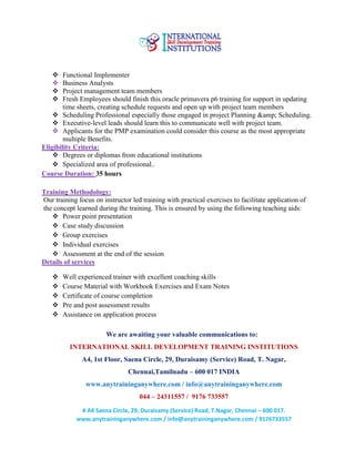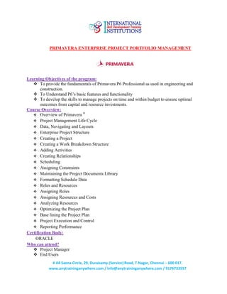 The document outlines a training program for Primavera P6 Project Portfolio Management, aimed at teaching participants the fundamental features and functionalities of the software. It includes details on course content, eligibility criteria, training methodology, and the types of attendees for the program, such as project managers and business analysts. The course lasts 35 hours and offers practical exercises and certification upon completion.