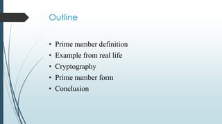 The document discusses prime numbers, defining them as integers greater than one with only 1 and itself as factors, and exploring their applications in nature and cryptography. It highlights the significance of prime numbers in the cicada lifecycle and details their role in encryption methods like RSA. The document concludes with the concept of Mersenne primes and the importance of prime numbers in mathematics and security.