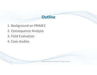 The document discusses the Prime2 model for wind effects on buildings, detailing its features, including improved theories for building wake effects and downwash predictions. It presents the evaluation of the model's predictions against field data and addresses its overprediction tendencies compared to prior models. The conclusion highlights the need for ongoing collaboration to enhance the model and address its shortcomings.