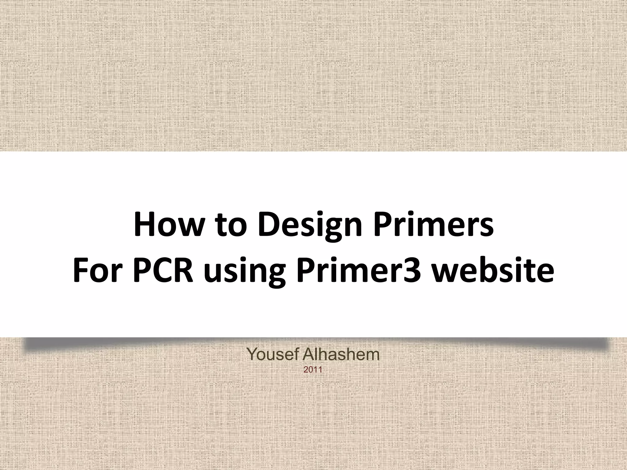 This document provides instructions for designing primers for PCR using the Primer3 website. It explains that PCR involves cycling between DNA denaturation, annealing of primers, and elongation to amplify a target DNA sequence. Good primers are around 20 nucleotides long with a GC percentage of 50-60% and melting temperature around 60°C. The document guides obtaining a target DNA sequence from NCBI and using Primer3 to design primers, specifying amplicon size and target region. It recommends checking primer specificity using NCBI BLAST.