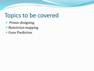 The document discusses topics to be covered in an IICB course on 8th December 2012, including primer designing, restriction mapping, and gene prediction. It provides information and guidelines on these topics, such as the appropriate length and properties of primers, the four types of restriction enzymes, and methods for gene prediction including patterns, frame consistency, dicodon frequencies, position-specific scoring matrices, and coding potential. Relevant references and websites discussing these techniques are also listed.