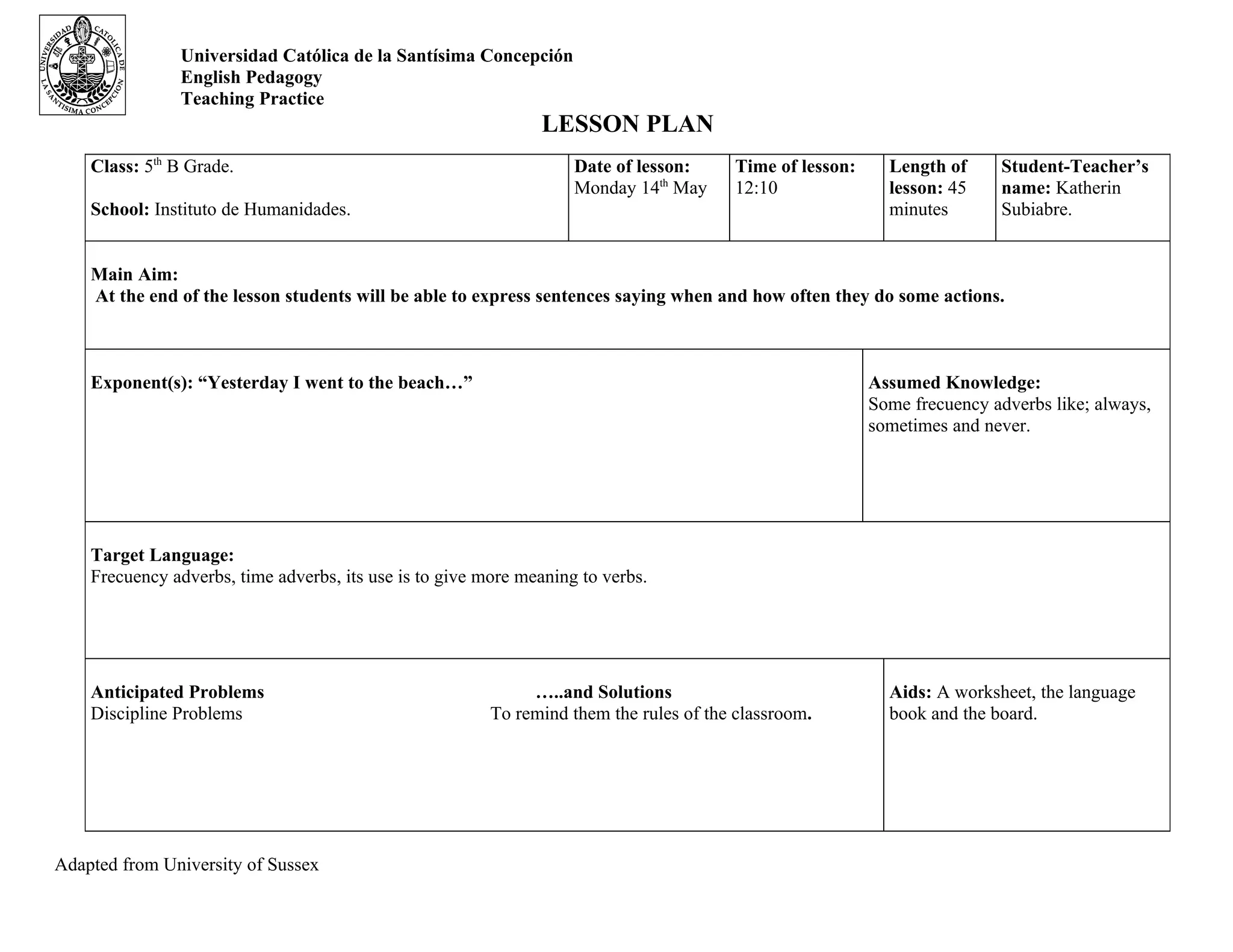 The lesson plan outlines a 45-minute English class for 5th grade students focusing on teaching frequency adverbs, time adverbs, and their use in sentences. Students will first discuss examples of when and how often they do activities, then the teacher will present the target language on the board and have students practice with a worksheet and language book exercise before writing a paragraph on their daily routine. Potential problems addressed include discipline issues that will be handled by reminding students of classroom rules.