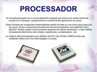 PROCESSADOR Un microprocessadorés un circuit electrònic integrat que actua com unitat central de procés d'un ordinador, proporcionant el control de les operacions de calcul. Estan formats per componets extremadament petits formats en una única peça plana de poc gruix. El seu component principal són els semiconductors, principalment silici i germani. Poden arribar a tenir diverses desenes de milions transistors, a més d'altres components electrònics com díodes, resistències, condensadors...etc. La majoria dels processadors que utilitzen els PC's són d'Intel o AMD encara que existeixen altres com Via Technologies o Crusoe.