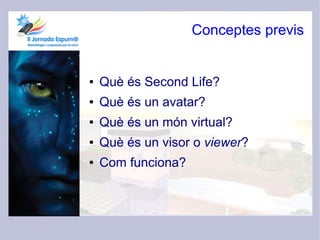 següents: RealXtend, Hippo Viewer, Meerkat, Second Life, ...