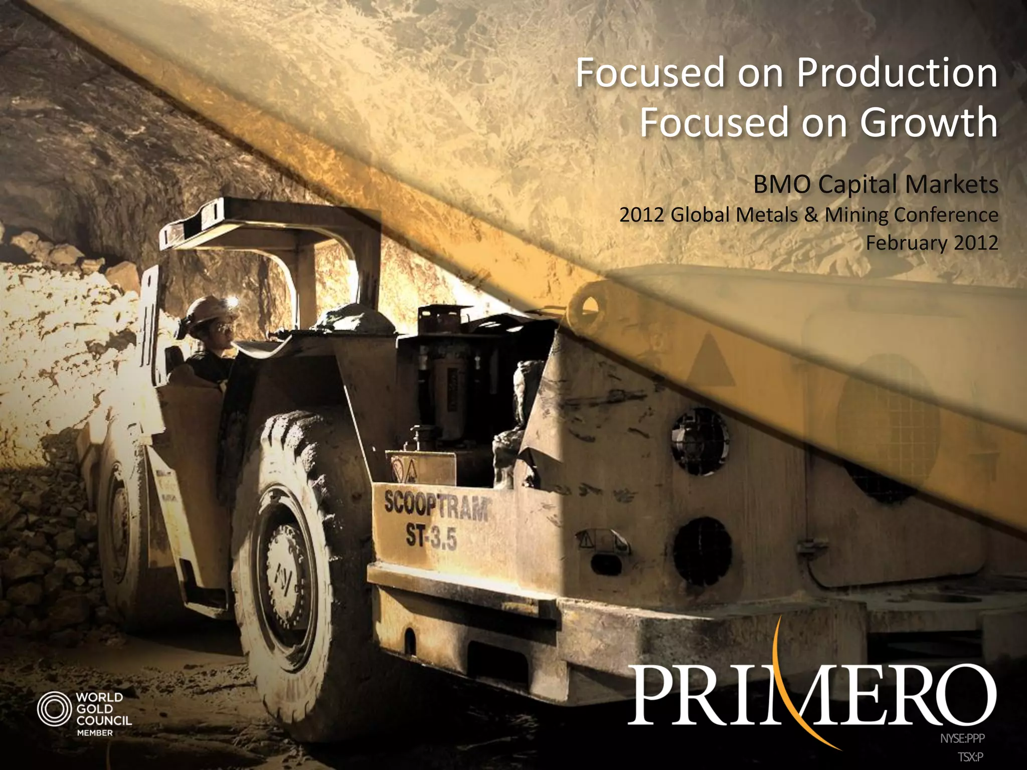 Primero Mining Corporation operates the San Dimas gold-silver mine in Mexico, which has produced over 11 million ounces of gold and 590 million ounces of silver over 100+ years of mining. The company is focused on increasing throughput and reducing costs at San Dimas, as well as exploring expansion opportunities through continued exploration success. Primero's goal is to become an intermediate gold producer through optimization and expansion of San Dimas, as well as pursuing acquisition opportunities to diversify its asset base.