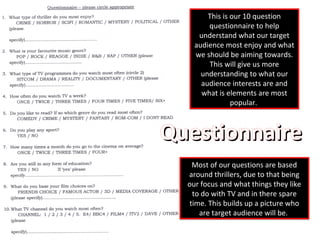 This script is for a primary talk that is short and brief due to time constraints. The dialogue fits the criteria for a scene that will demonstrate shot reverse shot and the 180 degree rule. When preparing for the preliminary, the main focus was on understanding camera angles and their proper usage. A questionnaire was also used to help understand the target audience's interests, which indicated that mystery thrillers, indie music, drama shows, and crime/mystery books were most popular. From this research, the key aspects to entice the target audience were determined.