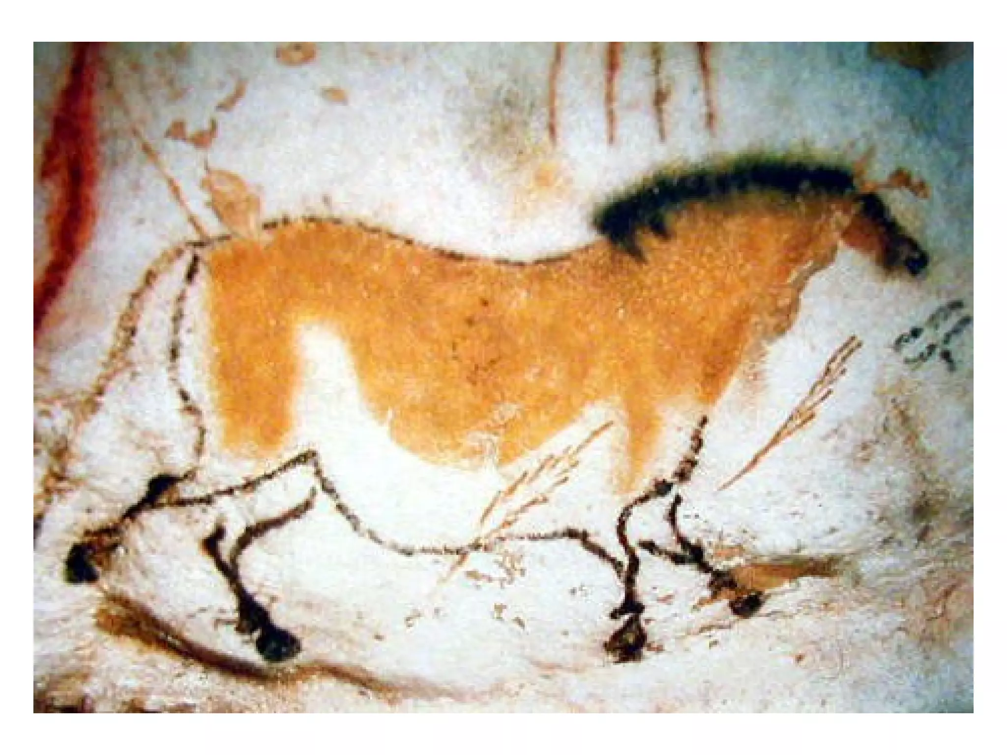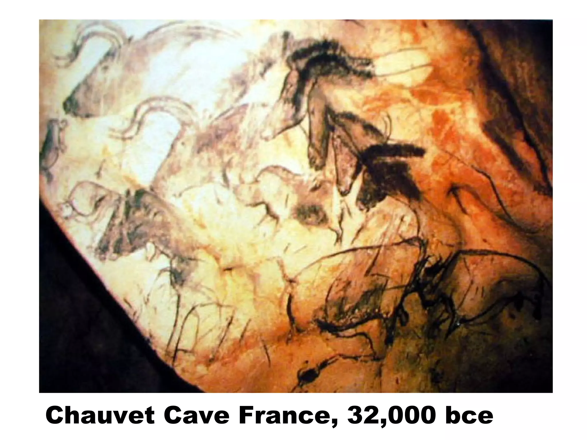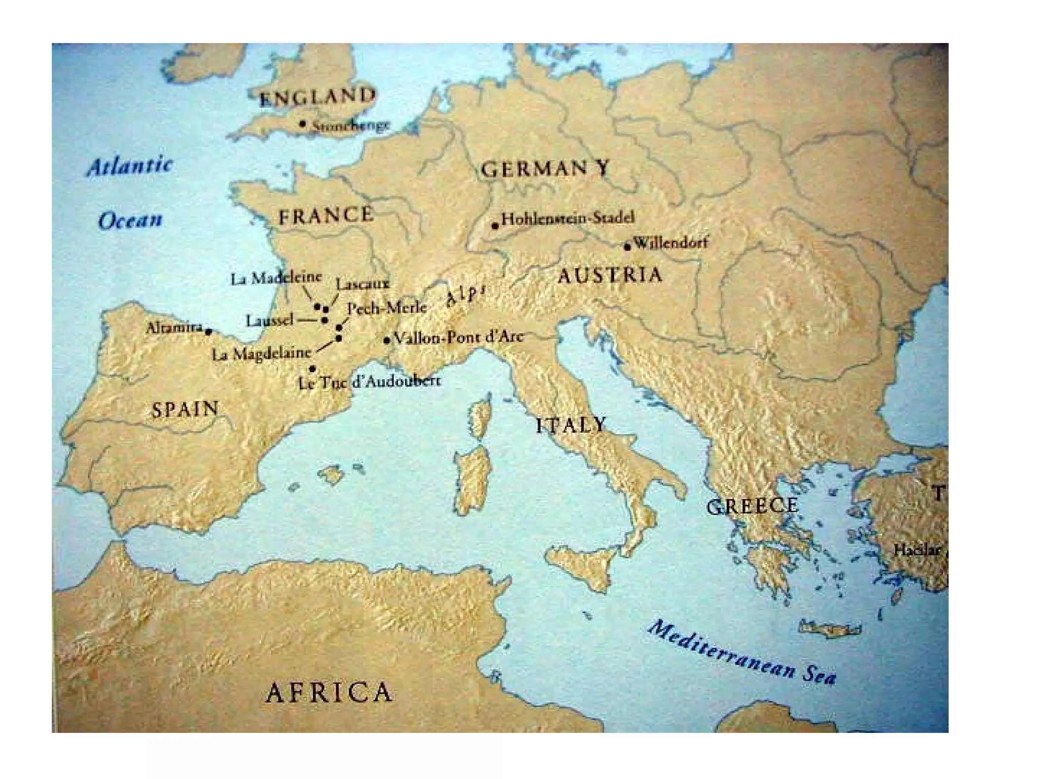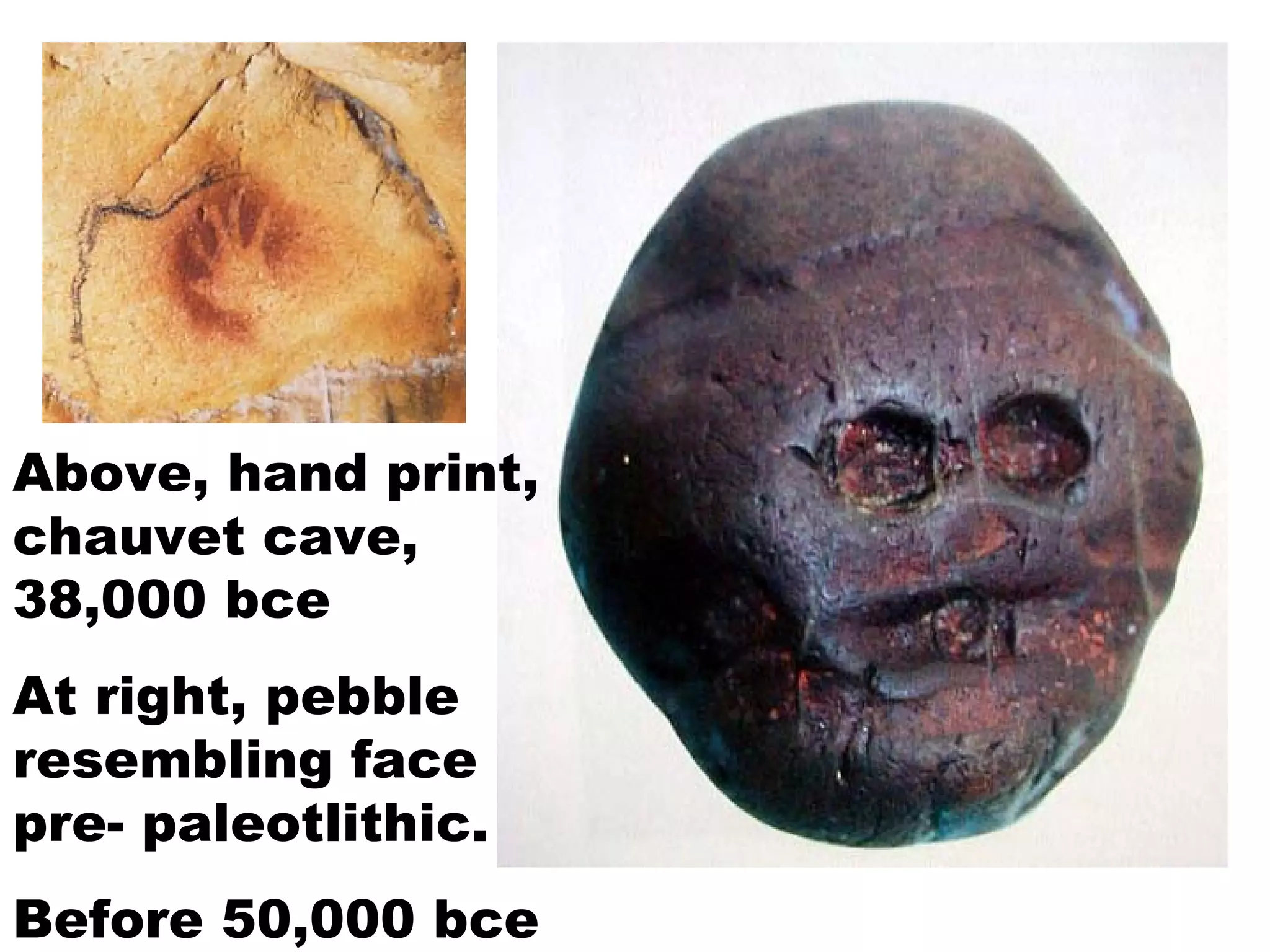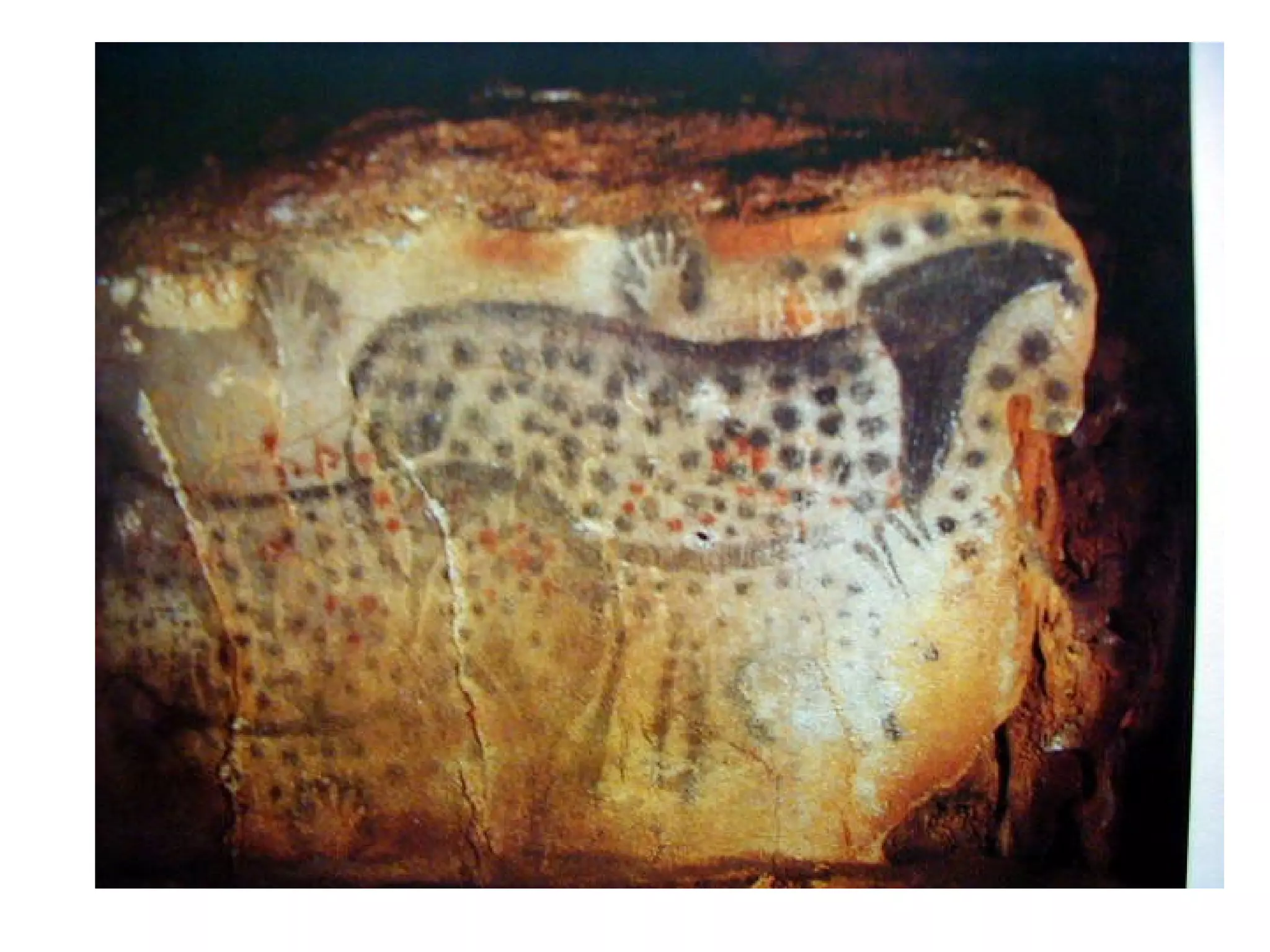 The document shows examples of early cave paintings and artifacts from prehistoric sites across Europe and Turkey dating from 38,000 BCE to 3,500 BCE, including hand prints in Chauvet Cave in France dated to around 32,000 BCE, paintings of bison in the Altamira Cave in Spain from around 13,000 BCE, and one of the earliest known landscapes painted on a wall in Turkey around 6,000 BCE.