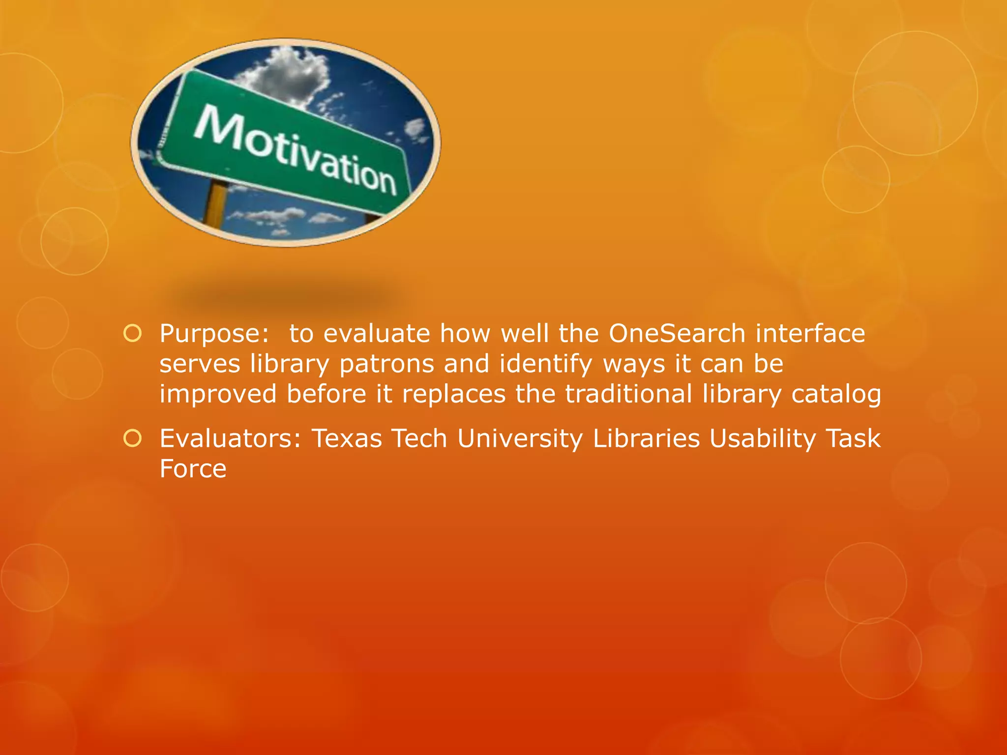 The document outlines a usability study conducted by Texas Tech University Libraries to evaluate the effectiveness of the OneSearch interface in serving library patrons. The study involved various tasks and employed different usability methods, revealing that novice users had the most success while identifying several improvement areas, mostly cosmetic. Overall feedback was positive, with the recognition that many identified problems could be easily fixed.