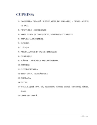 Documentul oferă un ghid cuprinzător despre tehnicile de prim ajutor în situații de urgență, cum ar fi evaluarea stării pacientului, asigurarea căilor respiratorii și resuscitarea cardiopulmonară. Se subliniază importanța rapidității și corectitudinii în acordarea ajutorului pentru a crește șansele de supraviețuire ale victimei, inclusiv aplicarea eficientă a compresiilor toracice și ventilțiilor artificiale. De asemenea, se discută despre gestionarea obstrucției căilor aeriene și necesitatea instruirii populației pentru a putea reacționa corespunzător în caz de urgențe.