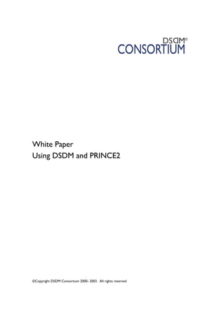 This document discusses how the project management methodology PRINCE2 can be used alongside the agile project methodology DSDM. It finds that while the two approaches overlap in some areas, DSDM is focused more on product delivery while PRINCE2 provides management controls. The document provides examples of how PRINCE2 products map to DSDM products and outputs. It suggests breaking down the large PRINCE2 Project Initiation Document into smaller initial planning documents covered by DSDM. The development plan is still recommended to refine later phase activities.