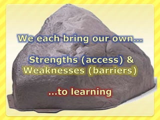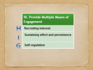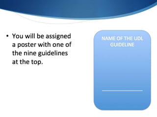 This document discusses utilizing the Universal Design for Learning (UDL) framework to impact student learning and expression. It provides an overview of the goals and agenda for a session on UDL, which includes understanding the three UDL principles, analyzing how UDL supports meeting standards, and identifying UDL-aligned resources. The overall goal is to build awareness of UDL strategies to create flexible learning environments that address learner variability and reduce barriers to access the curriculum.