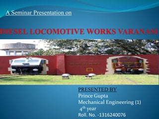 Prince Gupta presented on the various production shops at Diesel Locomotive Works (DLW) in Varanasi, India. DLW was established in 1956 to manufacture diesel-electric locomotives for Indian Railways. It has production shops for heavy welding, maintenance, light machine work, and rotor assembly. Within these shops specialized welding techniques like SMAW are used to join locomotive components. Preventative maintenance is also important to minimize breakdowns and keep production efficient. The pipe shop specifically fabricates pipes to transport fuel, air, and water throughout the trains.