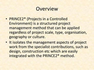 PRINCE2 is a structured project management method that can be applied to projects regardless of scale, type, organization, geography, or culture. It separates the management aspects of a project from the technical work. Key benefits include ensuring business justification, involving senior management, facilitating controls, providing communication, and allowing projects to be stopped and restarted under management control. PRINCE2 is based on principles like continued business justification and defined roles and responsibilities. It addresses themes like business case, organization, quality, plans, risk, change, and progress through processes like starting up a project, directing a project, and closing a project.