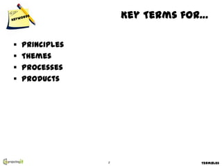 The document outlines key terms related to PRINCE2 certification, focusing on its principles, themes, processes, and management roles. It includes specific terms such as business case, quality, plans, risk, and stages of project management. Overall, it serves as a concise reference for fundamental concepts in PRINCE2 methodology.