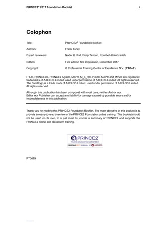 The Prince2 Foundation Booklet serves as a comprehensive guide for understanding the Prince2 project management methodology, supporting both online and classroom training. It outlines critical components such as principles, themes, processes, and the importance of a structured approach to project management. The booklet emphasizes the practical application of Prince2 through various project examples and provides insight into the associated exam syllabus.