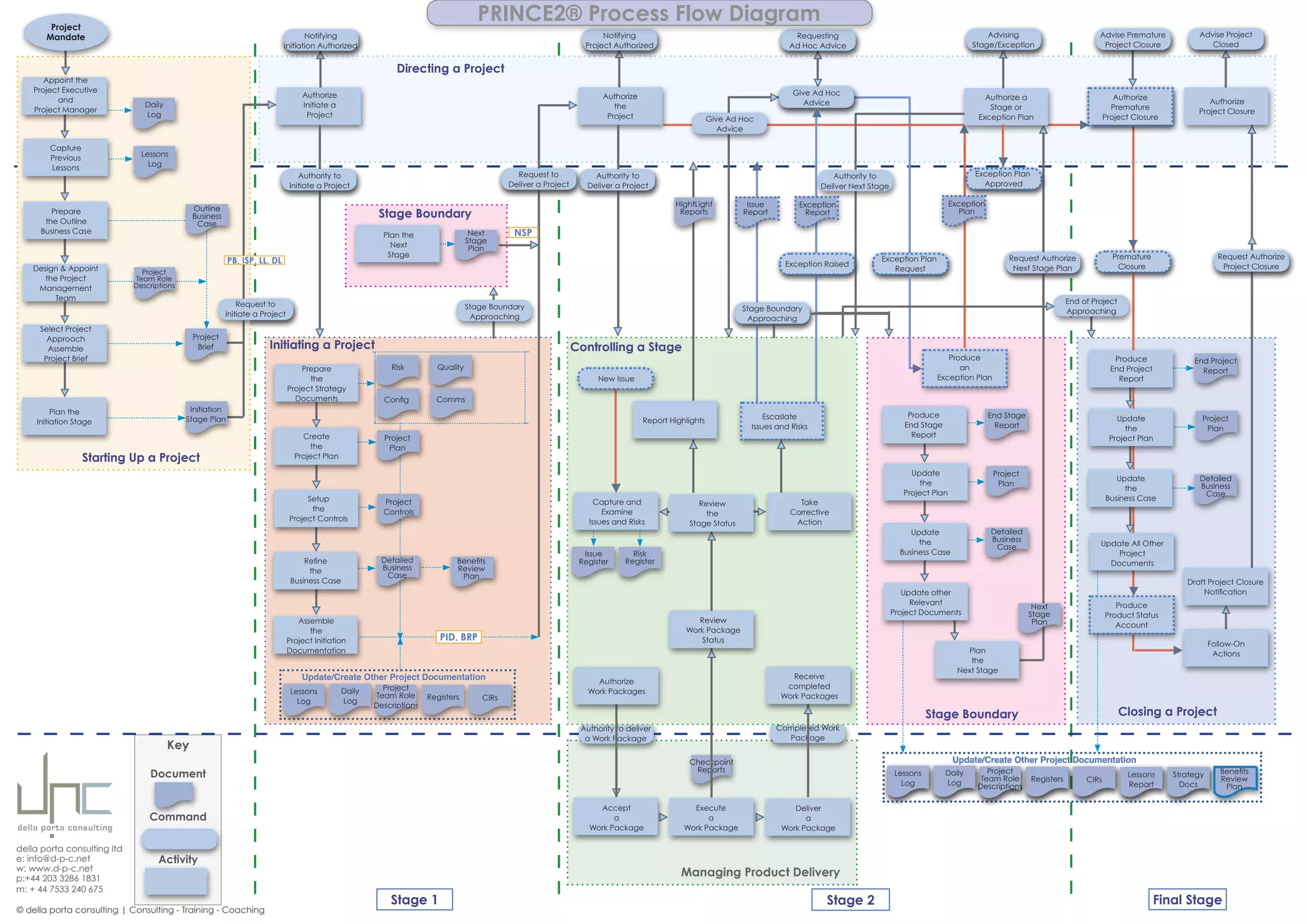 The document outlines the key processes, activities, and documents involved in managing a project using the PRINCE2 methodology. It shows the initiation stage where the project is planned and authorized to start. It then illustrates the stages of directing a project, managing delivery, and controlling stages to completion. Key activities include initiating projects, authorizing stages/exceptions, updating plans and documentation, and closing projects.