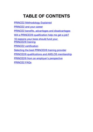 PRINCE2 is a leading structured project management methodology designed to provide organizations with clear guidance on managing projects effectively, offering seven principles, themes, and processes for successful implementation. It benefits individuals by enhancing career prospects, salary, and confidence while also improving organizational project management practices. The document emphasizes the importance of PRINCE2 certification and training for both job seekers and organizations to adapt to the evolving project management landscape.