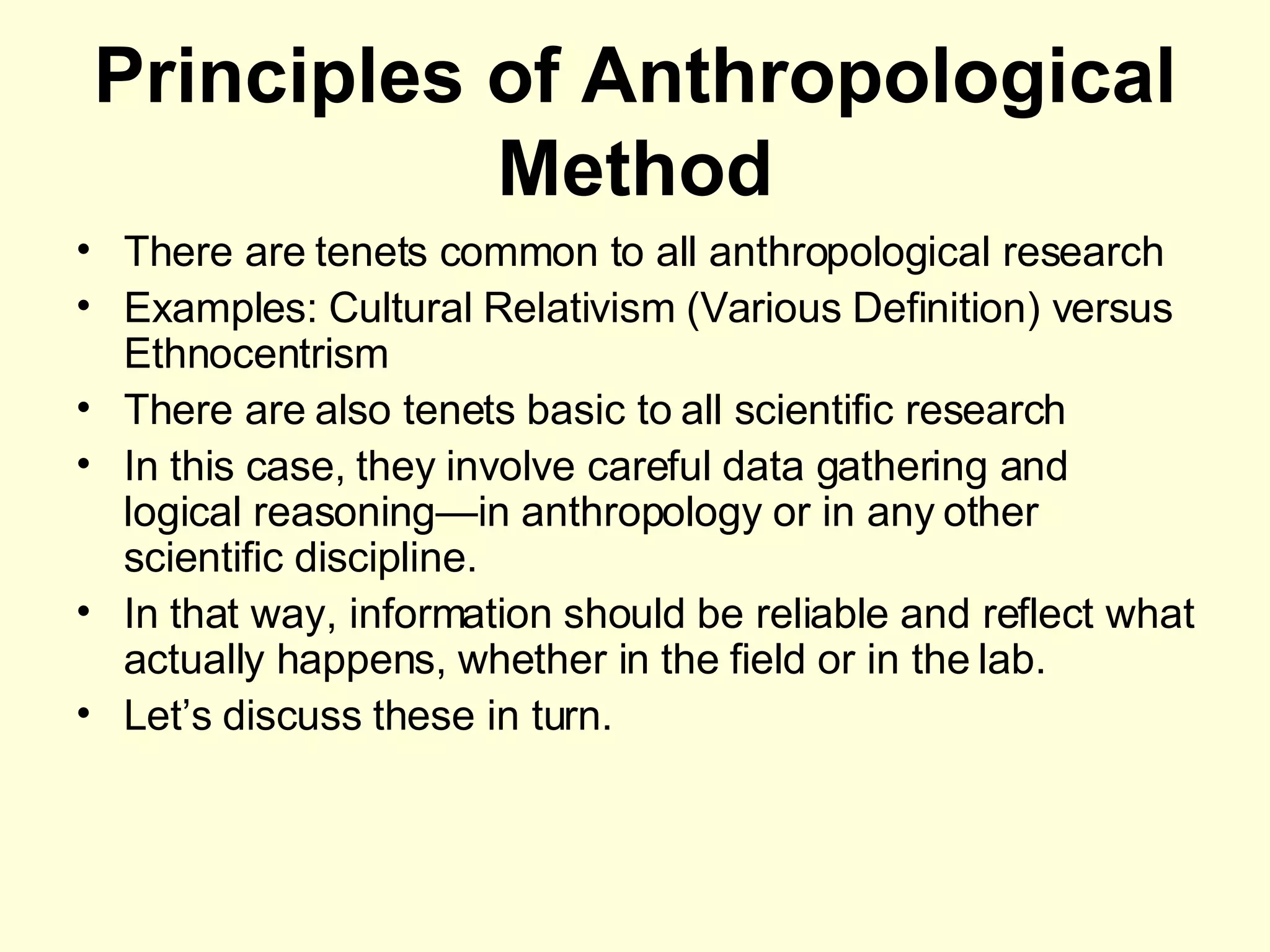 The document discusses principles of scientific method and anthropological method. It outlines tenets of anthropological research like cultural relativism versus ethnocentrism. It then discusses key concepts in scientific research like developing hypotheses, testing hypotheses, and replicating results. It also summarizes Lett's "Six-Way Test" for evaluating hypotheses, which includes falsifiability, logic, comprehensiveness, honesty, replicability, and sufficiency.
