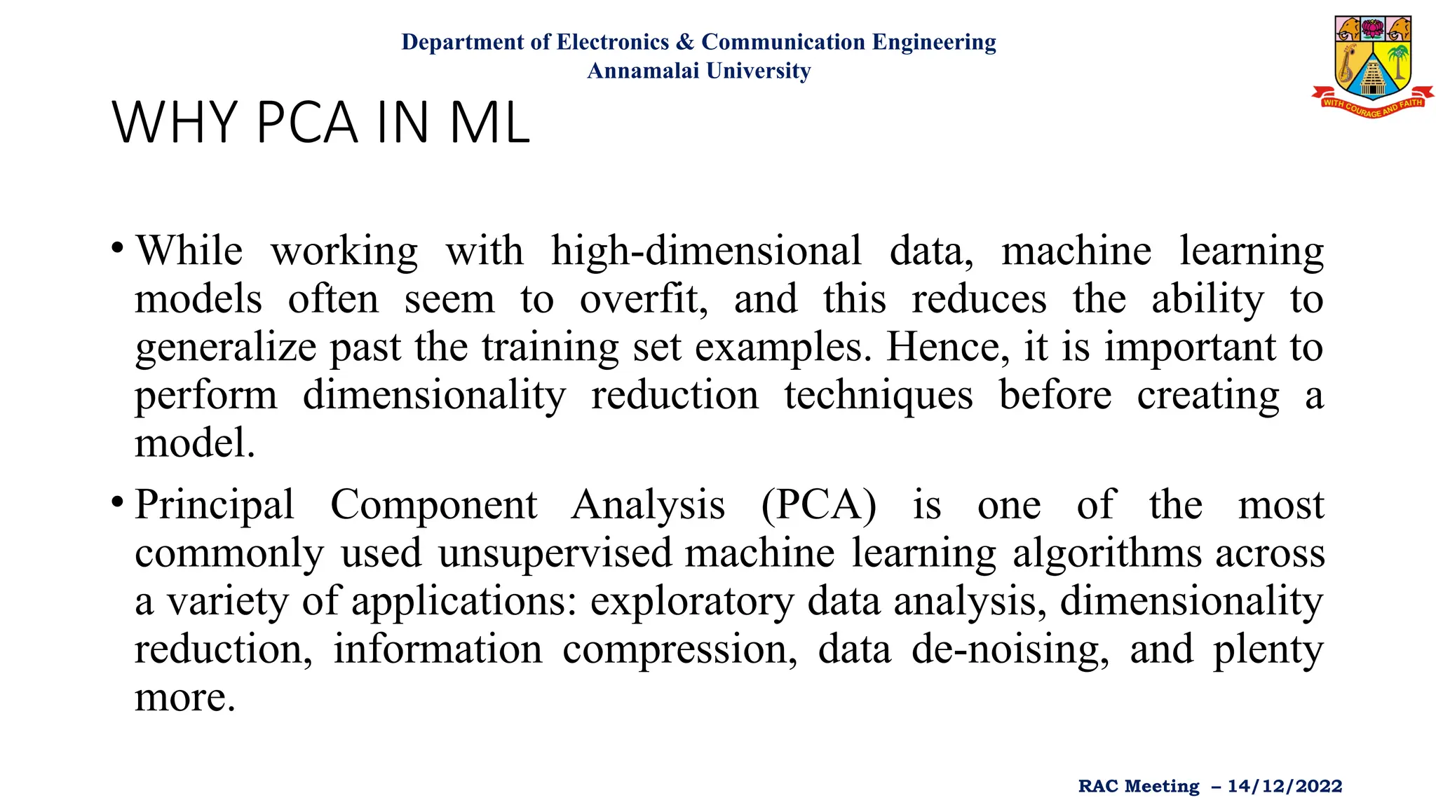 Principal Component Analysis (PCA) is an unsupervised machine learning technique used for dimensionality reduction, enhancing interpretability while minimizing information loss. It identifies principal components that explain the maximum variance within a dataset and is widely applied in various fields such as healthcare, finance, and image processing. Although PCA is computationally efficient and helps prevent overfitting, it presents challenges such as low interpretability of principal components and potential information loss.
